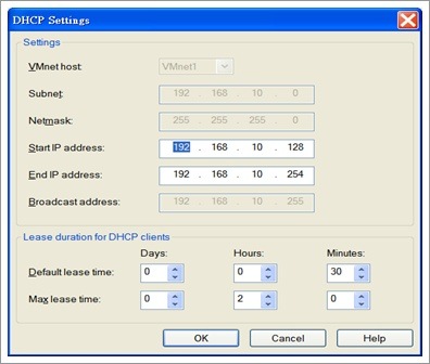 按下DHCP,可以了解VMnet1 DHCP自動分配IP的預設起迄為128254,租期最短30分最長2hr。